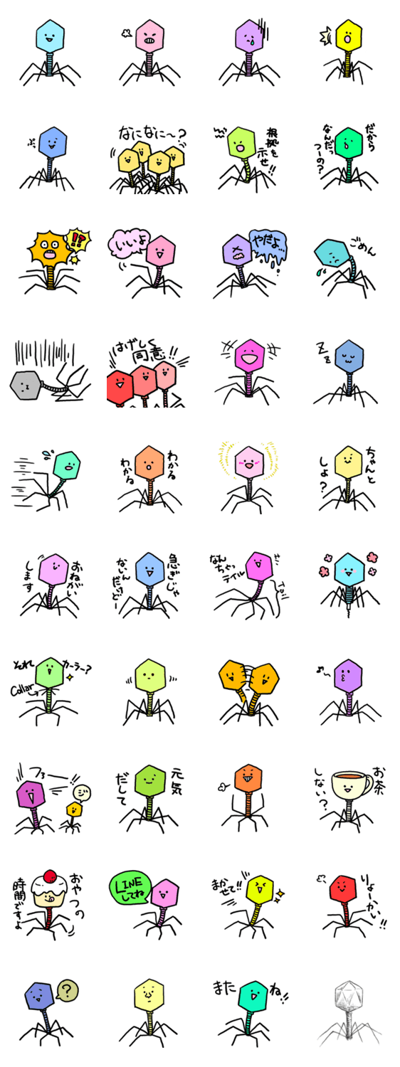ファージさん ShimaPhage コメントをどうぞ みんなのまわりにたくさんいるバクテリオファージのスタンプです。スタンプを使ってファージたちが身近にいることを感じてみて。 このスタンプどう思う?!↓クリックで投票♪好き (0)かわいい (1)かっこいい (1)おもしろい (0)使いやすそう (0)欲しい (1)萌え (1)ほっこりする (35)おしゃれ (0)ゆるい (1)こわい (0)ウザい (0)キモい (0)ムカつく (0)持ってる (0)癒される (1)セクシー (0)個性的 (0)私は買わない (0)誰かプレゼントして! (32) 購入・プレゼントする Facebookでシェア Twitterでシェア