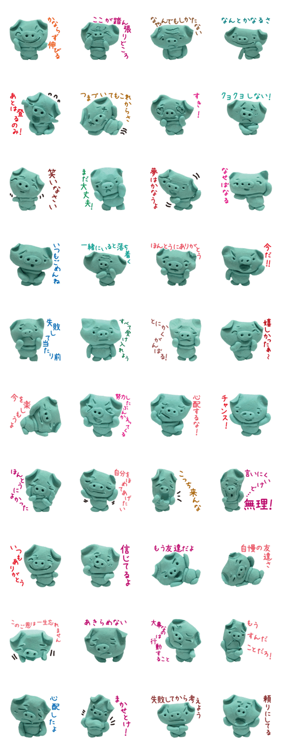 ブタねんど プクムク コメントをどうぞ 「いつでも前向き」な気持ちを大切にしながら制作しました。感謝の心や行動力、やる気、元気などのエネルギー溢れるポジティブな言葉を粘土のぶたさんがつぶやいています。 このスタンプどう思う?!↓クリックで投票♪好き (0)かわいい (0)かっこいい (0)おもしろい (0)使いやすそう (0)欲しい (0)萌え (0)ほっこりする (0)おしゃれ (0)ゆるい (0)こわい (0)ウザい (0)キモい (0)ムカつく (0)持ってる (0)癒される (0)セクシー (0)個性的 (0)私は買わない (0)誰かプレゼントして! (0) 購入・プレゼントする Facebookでシェア Twitterでシェア