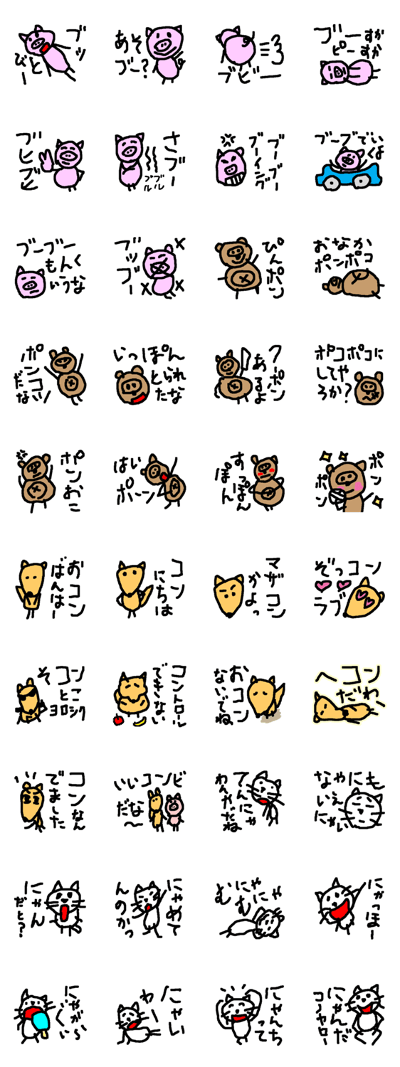 ブーブーポココンニャ Giyapan コメントをどうぞ ぶた、たぬき、きつね、ねこの鳴き声文字をメッセージにいれました。子供が書いたような、ゆるいらくがき風の絵です。 このスタンプどう思う?!↓クリックで投票♪好き (0)かわいい (0)かっこいい (0)おもしろい (0)使いやすそう (0)欲しい (0)萌え (0)ほっこりする (0)おしゃれ (0)ゆるい (0)こわい (0)ウザい (0)キモい (0)ムカつく (0)持ってる (0)癒される (0)セクシー (0)個性的 (0)私は買わない (0)誰かプレゼントして! (0) 購入・プレゼントする Facebookでシェア Twitterでシェア