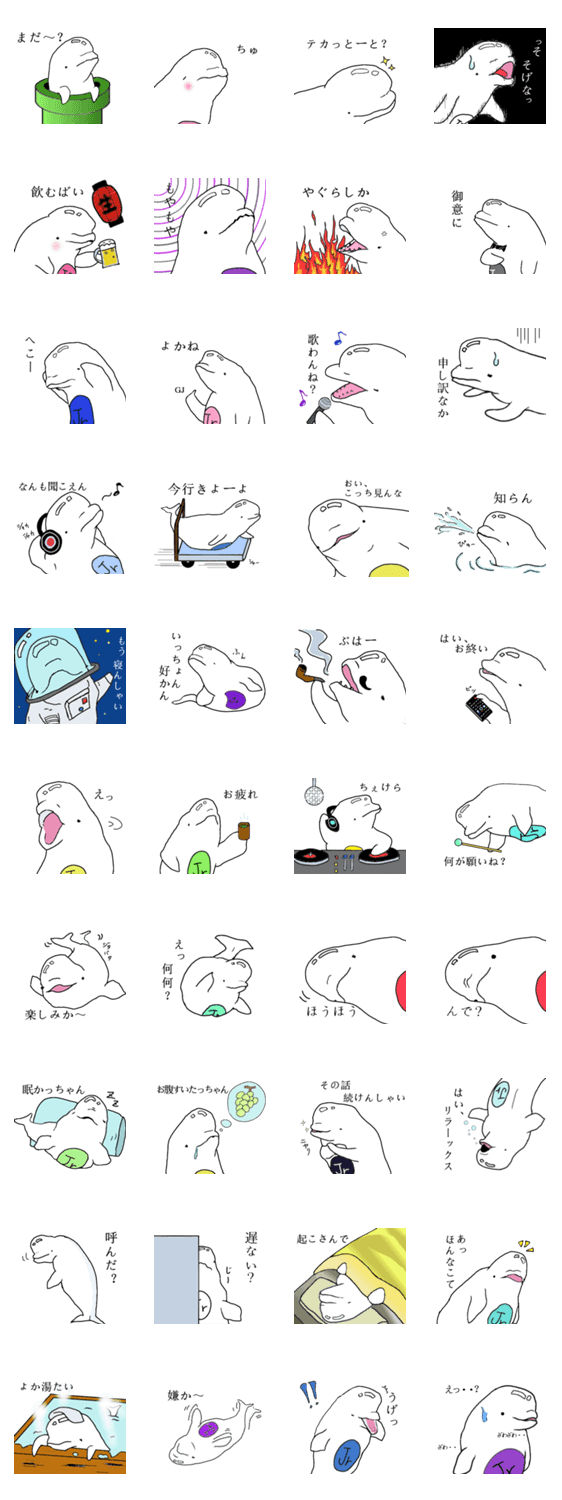 ベルーガJr「九州憧れ」 13 コメントをどうぞ 水族館のアイドル、テカテカ頭のベルーガ(シロイルカ)です。現在九州の方言にハマり中。画力にブレがあるのはご愛嬌。さぁ文字打つのめんどい時はコレで決まり。 このスタンプどう思う?!↓クリックで投票♪好き (0)かわいい (0)かっこいい (0)おもしろい (0)使いやすそう (0)欲しい (0)萌え (0)ほっこりする (0)おしゃれ (0)ゆるい (0)こわい (0)ウザい (0)キモい (0)ムカつく (0)持ってる (0)癒される (0)セクシー (0)個性的 (0)私は買わない (0)誰かプレゼントして! (0) 購入・プレゼントする Facebookでシェア Twitterでシェア