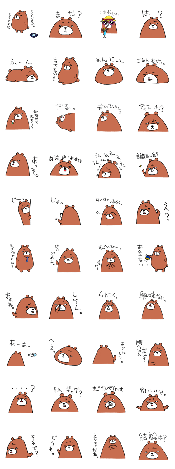 ポイズンベアーくまひこ march note コメントをどうぞ イラついていたり、だるかったり、めんどくさかったり、そんな時に使えるクマのスタンプです。なんとなくモヤモヤした気分をアピールしたいときに使ってみてください。 このスタンプどう思う?!↓クリックで投票♪好き (0)かわいい (0)かっこいい (0)おもしろい (0)使いやすそう (0)欲しい (0)萌え (0)ほっこりする (0)おしゃれ (0)ゆるい (0)こわい (0)ウザい (0)キモい (0)ムカつく (0)持ってる (0)癒される (0)セクシー (0)個性的 (0)私は買わない (0)誰かプレゼントして! (0) 購入・プレゼントする Facebookでシェア Twitterでシェア
