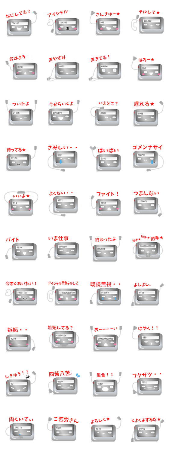 ポケベルが鳴っています。 キノ コメントをどうぞ 初期の数字のみのポケベル世代は、この数字だけで会話していたのだから、このスタンプでも会話できるはず!「10391101」キュンキュンしますね。あの頃は純粋だったなぁ・・ このスタンプどう思う?!↓クリックで投票♪好き (0)かわいい (0)かっこいい (0)おもしろい (0)使いやすそう (0)欲しい (0)萌え (0)ほっこりする (0)おしゃれ (0)ゆるい (0)こわい (0)ウザい (0)キモい (0)ムカつく (0)持ってる (0)癒される (0)セクシー (0)個性的 (0)私は買わない (0)誰かプレゼントして! (0) 購入・プレゼントする Facebookでシェア Twitterでシェア
