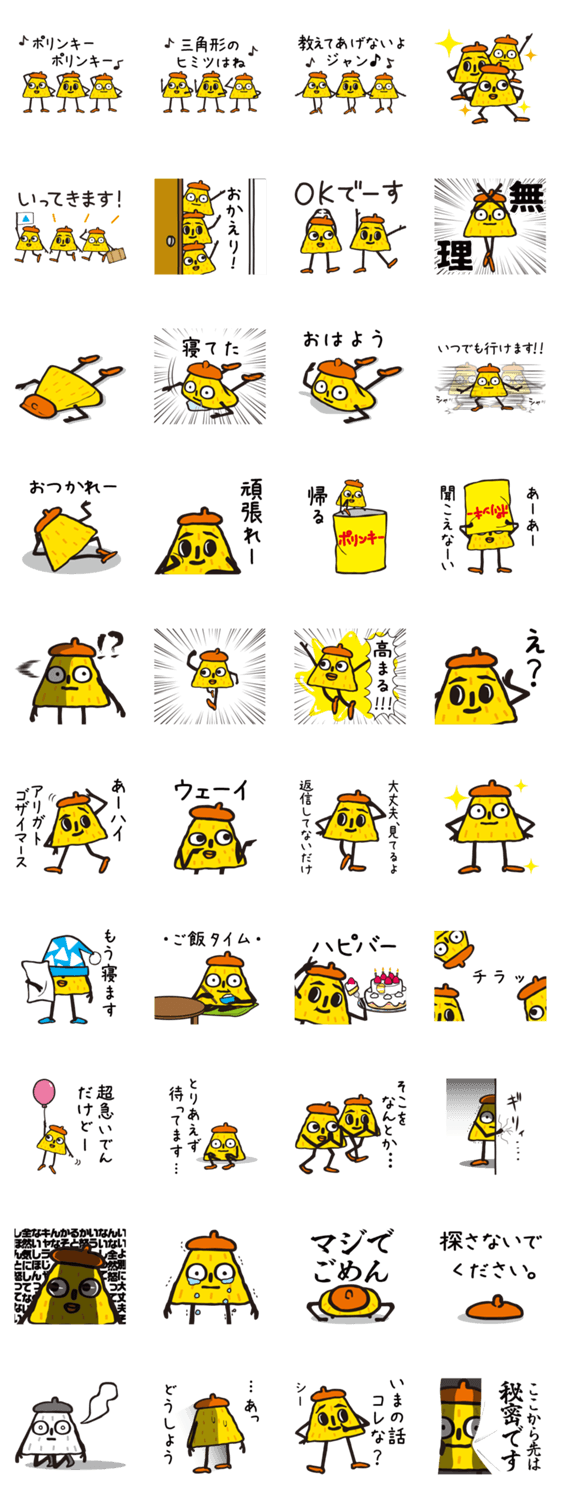 ポリンキーのヒミツスタンプ 株式会社 湖池屋 コメントをどうぞ 湖池屋のポリンキーが楽しいスタンプになりました!スリーポリンキーズ達が会話を楽しく盛り上げてくれますが、三角形のヒミツは教えてくれません。 このスタンプどう思う?!↓クリックで投票♪好き (2)かわいい (1)かっこいい (0)おもしろい (0)使いやすそう (1)欲しい (1)萌え (0)ほっこりする (1)おしゃれ (0)ゆるい (1)こわい (0)ウザい (0)キモい (0)ムカつく (0)持ってる (0)癒される (1)セクシー (0)個性的 (0)私は買わない (0)誰かプレゼントして! (1) 購入・プレゼントする Facebookでシェア Twitterでシェア