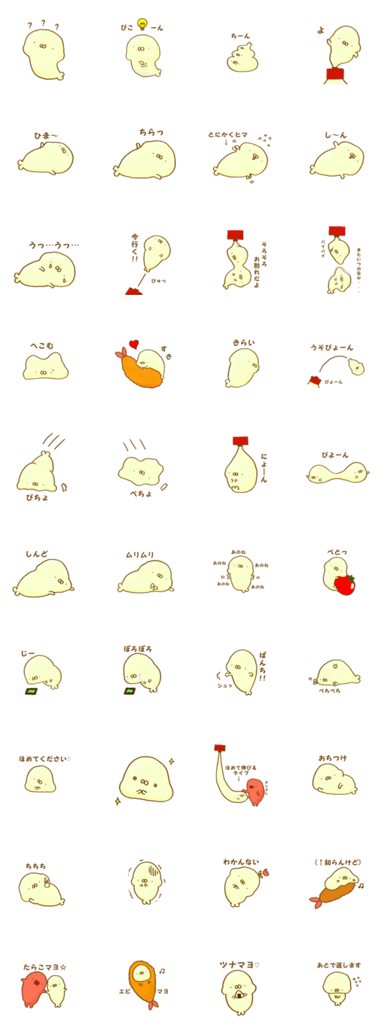 マヨざらし yukidaruman コメントをどうぞ マヨネーズでできたあざらし「マヨざらし」の、ゆるくて可愛いスタンプです。つるつるもちもちしています。エビフライが好きです。 このスタンプどう思う?!↓クリックで投票♪好き (0)かわいい (0)かっこいい (0)おもしろい (0)使いやすそう (0)欲しい (0)萌え (0)ほっこりする (0)おしゃれ (0)ゆるい (0)こわい (0)ウザい (0)キモい (0)ムカつく (0)持ってる (0)癒される (0)セクシー (0)個性的 (0)私は買わない (0)誰かプレゼントして! (0) 購入・プレゼントする Facebookでシェア Twitterでシェア