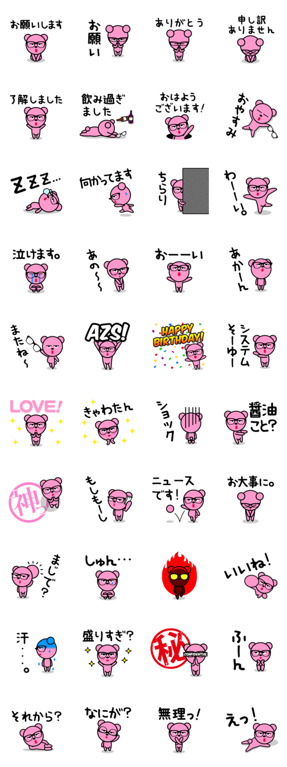 メガネのピンクベア クイックリバー コメントをどうぞ 脱力系、黒縁メガネのピンクベア。表情硬めで、おとなしい性格です。 このスタンプどう思う?!↓クリックで投票♪好き (0)かわいい (0)かっこいい (0)おもしろい (0)使いやすそう (0)欲しい (0)萌え (0)ほっこりする (0)おしゃれ (0)ゆるい (0)こわい (0)ウザい (0)キモい (0)ムカつく (0)持ってる (0)癒される (0)セクシー (0)個性的 (0)私は買わない (0)誰かプレゼントして! (0) 購入・プレゼントする Facebookでシェア Twitterでシェア