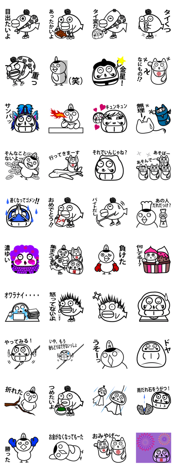 メッセージだるま、福くる代4 coorina コメントをどうぞ だるまの「福くる代」、招き猫の「幸よぶ代」、鶴の「富ます代」、そして鯛の「目出たい代」のスタンプです。老若男女問わず、皆さんにお使いいただけると思います。 このスタンプどう思う?!↓クリックで投票♪好き (0)かわいい (0)かっこいい (0)おもしろい (0)使いやすそう (0)欲しい (0)萌え (0)ほっこりする (0)おしゃれ (0)ゆるい (0)こわい (0)ウザい (0)キモい (0)ムカつく (0)持ってる (0)癒される (0)セクシー (0)個性的 (0)私は買わない (0)誰かプレゼントして! (0) 購入・プレゼントする Facebookでシェア Twitterでシェア