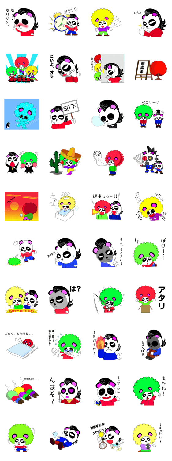 モヒパンダとアフロ3兄弟 9painjapan コメントをどうぞ モヒカン頭のスラッシュにアフロ頭のドット、カレット、コロンの3兄弟。お茶目でカワイイ!ちょっぴり腹立つ!そんな彼らをスタンプで使いまくろう。 このスタンプどう思う?!↓クリックで投票♪好き (0)かわいい (0)かっこいい (0)おもしろい (0)使いやすそう (0)欲しい (0)萌え (0)ほっこりする (0)おしゃれ (0)ゆるい (0)こわい (0)ウザい (0)キモい (0)ムカつく (0)持ってる (0)癒される (0)セクシー (0)個性的 (0)私は買わない (0)誰かプレゼントして! (0) 購入・プレゼントする Facebookでシェア Twitterでシェア