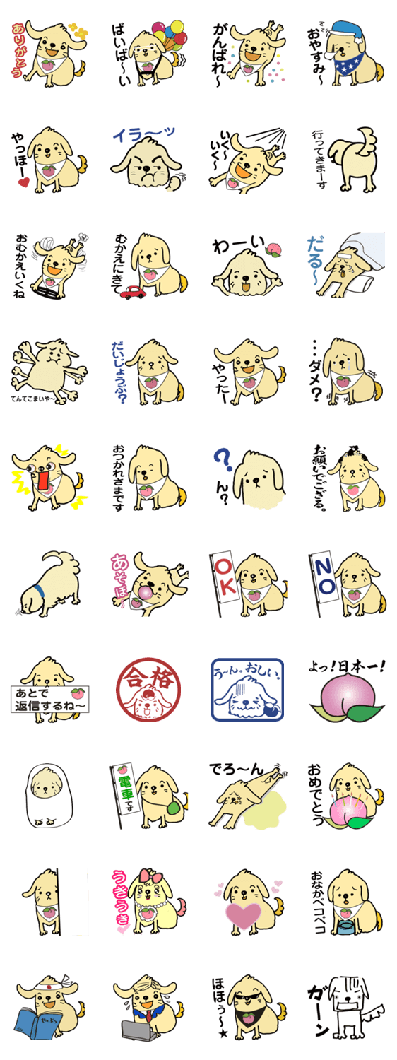 モモタロウ犬 Chiho コメントをどうぞ ひと言メッセンジャー、ゴールデンレトリバーのモモタロウくん参上。 このスタンプどう思う?!↓クリックで投票♪好き (0)かわいい (0)かっこいい (0)おもしろい (0)使いやすそう (0)欲しい (0)萌え (0)ほっこりする (0)おしゃれ (0)ゆるい (0)こわい (0)ウザい (0)キモい (0)ムカつく (0)持ってる (0)癒される (0)セクシー (0)個性的 (0)私は買わない (0)誰かプレゼントして! (0) 購入・プレゼントする Facebookでシェア Twitterでシェア