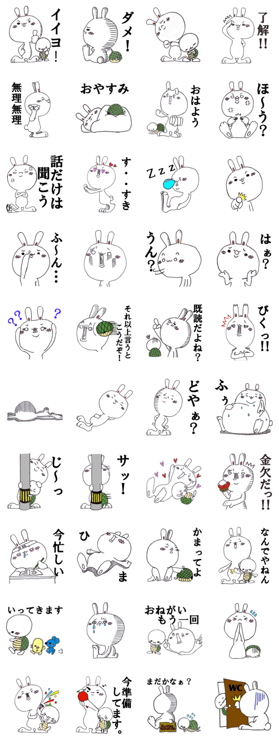 ラビとター お殿様 コメントをどうぞ いつもかけっこばかりやっている、ラビ(うさぎ)とター(かめ)。この二匹の普段をスタンプにしました。 このスタンプどう思う?!↓クリックで投票♪好き (0)かわいい (0)かっこいい (0)おもしろい (0)使いやすそう (0)欲しい (0)萌え (0)ほっこりする (0)おしゃれ (0)ゆるい (0)こわい (0)ウザい (0)キモい (0)ムカつく (0)持ってる (0)癒される (0)セクシー (0)個性的 (0)私は買わない (0)誰かプレゼントして! (0) 購入・プレゼントする Facebookでシェア Twitterでシェア