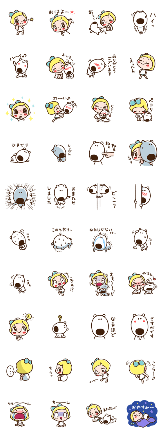 レモン&シュガーの日常 Lemon & Sugar コメントをどうぞ 元気いっぱい表情豊かな女の子「レモンちゃん」、無表情だけど愛嬌たっぷりなしろくま「シュガーくん」。なかよしの2人の甘酸っぱい日常スタンプです。 このスタンプどう思う?!↓クリックで投票♪好き (0)かわいい (0)かっこいい (0)おもしろい (0)使いやすそう (0)欲しい (0)萌え (0)ほっこりする (0)おしゃれ (0)ゆるい (0)こわい (0)ウザい (0)キモい (0)ムカつく (0)持ってる (0)癒される (0)セクシー (0)個性的 (0)私は買わない (0)誰かプレゼントして! (0) 購入・プレゼントする Facebookでシェア Twitterでシェア