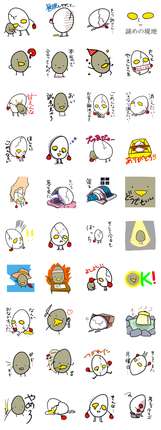 ワレタマゴ 壱 コメントをどうぞ 陰湿で無気力、割れた卵はそんな宿命なのである。(うずらの卵添え) このスタンプどう思う?!↓クリックで投票♪好き (0)かわいい (0)かっこいい (0)おもしろい (0)使いやすそう (0)欲しい (0)萌え (0)ほっこりする (0)おしゃれ (0)ゆるい (0)こわい (0)ウザい (0)キモい (0)ムカつく (0)持ってる (0)癒される (0)セクシー (0)個性的 (0)私は買わない (0)誰かプレゼントして! (0) 購入・プレゼントする Facebookでシェア Twitterでシェア