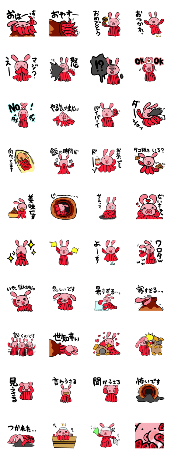 不思議生物うさタコ Kiyo コメントをどうぞ 頭がウサギ、体がタコのちょっぴり不思議な生物うさタコ!可愛くて使ってみるとクセになる!?そんなスタンプを集めました。 このスタンプどう思う?!↓クリックで投票♪好き (0)かわいい (0)かっこいい (0)おもしろい (0)使いやすそう (0)欲しい (0)萌え (0)ほっこりする (0)おしゃれ (0)ゆるい (0)こわい (0)ウザい (0)キモい (0)ムカつく (0)持ってる (0)癒される (0)セクシー (0)個性的 (0)私は買わない (0)誰かプレゼントして! (0) 購入・プレゼントする Facebookでシェア Twitterでシェア