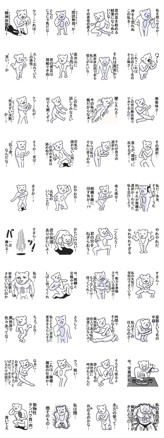 中二病くまさん。 第六排便魔王 コメントをどうぞ 中二病のクマのスタンプです。 このスタンプどう思う?!↓クリックで投票♪好き (0)かわいい (0)かっこいい (0)おもしろい (0)使いやすそう (0)欲しい (0)萌え (0)ほっこりする (0)おしゃれ (0)ゆるい (0)こわい (0)ウザい (0)キモい (0)ムカつく (0)持ってる (0)癒される (0)セクシー (0)個性的 (0)私は買わない (0)誰かプレゼントして! (0) 購入・プレゼントする Facebookでシェア Twitterでシェア