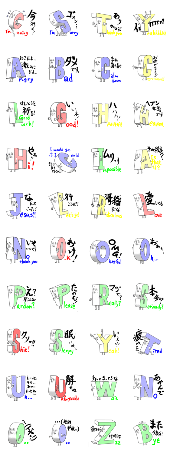 人面アルファベッツ 東大Stamp同好会(チームTAckY) コメントをどうぞ 愉快なアルファベット達が日常会話をしてくれるよ。英単語の勉強にもなるよ。 このスタンプどう思う?!↓クリックで投票♪好き (0)かわいい (0)かっこいい (0)おもしろい (0)使いやすそう (0)欲しい (0)萌え (0)ほっこりする (0)おしゃれ (0)ゆるい (0)こわい (0)ウザい (0)キモい (0)ムカつく (0)持ってる (0)癒される (0)セクシー (0)個性的 (0)私は買わない (0)誰かプレゼントして! (0) 購入・プレゼントする Facebookでシェア Twitterでシェア