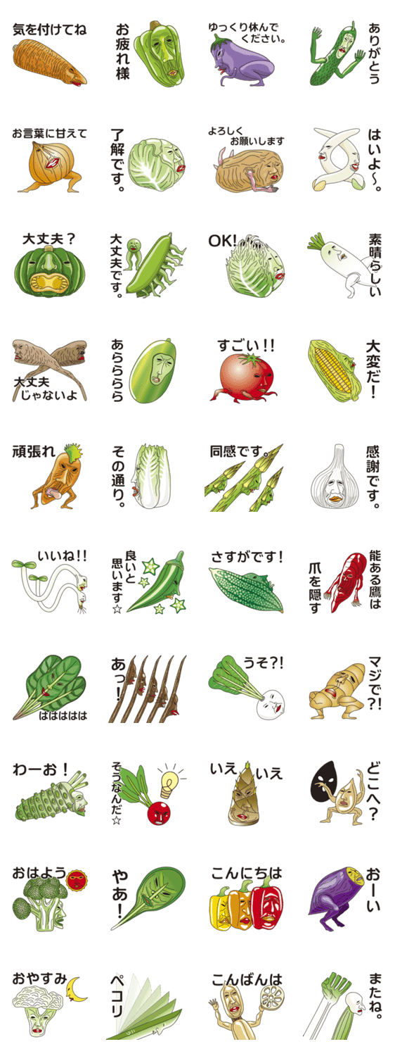 人面野菜たちの優れた対話 ピンコロ コメントをどうぞ 人の心を持った野菜たちは顔も人間そっくり。野菜が好きな人はもちろん、苦手な人も活用できる便利なスタンプです。さあ、毎日の会話に野菜を取り入れよう。 このスタンプどう思う?!↓クリックで投票♪好き (0)かわいい (0)かっこいい (0)おもしろい (0)使いやすそう (0)欲しい (0)萌え (0)ほっこりする (0)おしゃれ (0)ゆるい (0)こわい (0)ウザい (0)キモい (0)ムカつく (0)持ってる (0)癒される (0)セクシー (0)個性的 (0)私は買わない (0)誰かプレゼントして! (0) 購入・プレゼントする Facebookでシェア Twitterでシェア