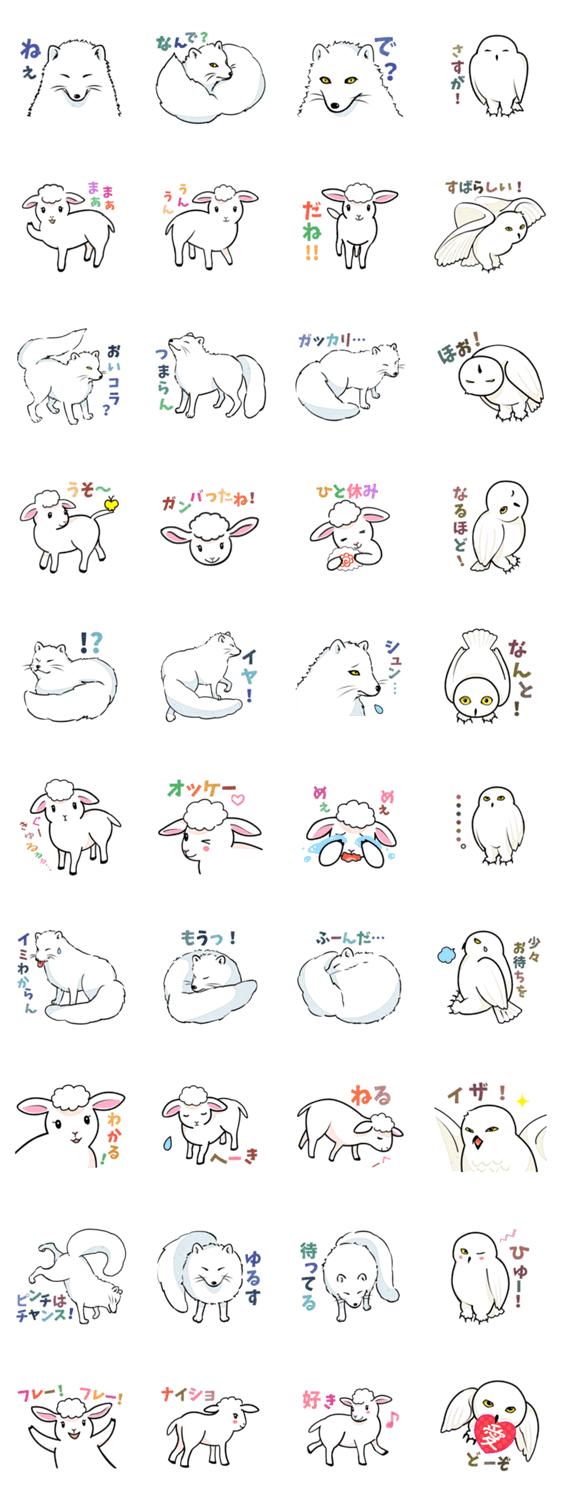 仔羊と白きつねと梟と… luluppa コメントをどうぞ 《ツン》な北極ギツネと《デレ》な子ひつじ《ホメ》な白フクロウのモフモフ白い動物トリオです。三者三様のリアクションを気分に合わせてお使い下さい。喧嘩中も使えます。 このスタンプどう思う?!↓クリックで投票♪好き (0)かわいい (0)かっこいい (0)おもしろい (0)使いやすそう (0)欲しい (0)萌え (0)ほっこりする (0)おしゃれ (0)ゆるい (0)こわい (0)ウザい (0)キモい (0)ムカつく (0)持ってる (0)癒される (0)セクシー (0)個性的 (0)私は買わない (0)誰かプレゼントして! (0) 購入・プレゼントする Facebookでシェア Twitterでシェア