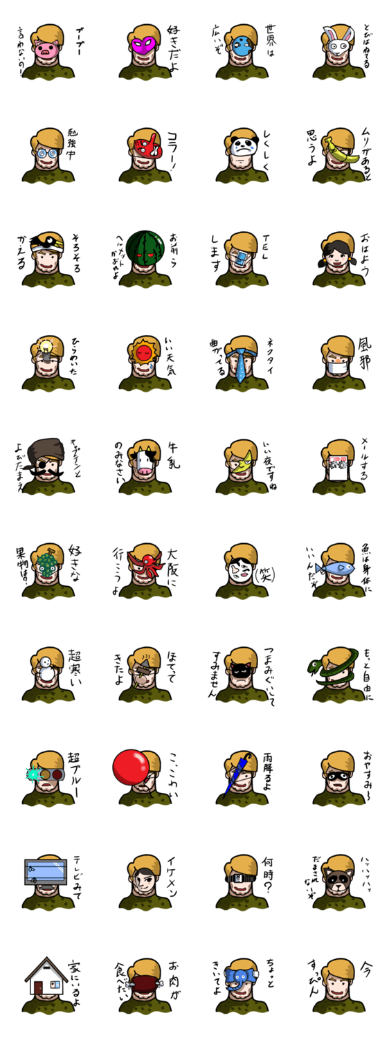 仮面軍曹 yumeoi コメントをどうぞ お茶目な軍曹が、仮面やかぶりもので全てを表現します。 このスタンプどう思う?!↓クリックで投票♪好き (0)かわいい (0)かっこいい (0)おもしろい (0)使いやすそう (0)欲しい (0)萌え (0)ほっこりする (0)おしゃれ (0)ゆるい (0)こわい (0)ウザい (0)キモい (0)ムカつく (0)持ってる (0)癒される (0)セクシー (0)個性的 (0)私は買わない (0)誰かプレゼントして! (0) 購入・プレゼントする Facebookでシェア Twitterでシェア