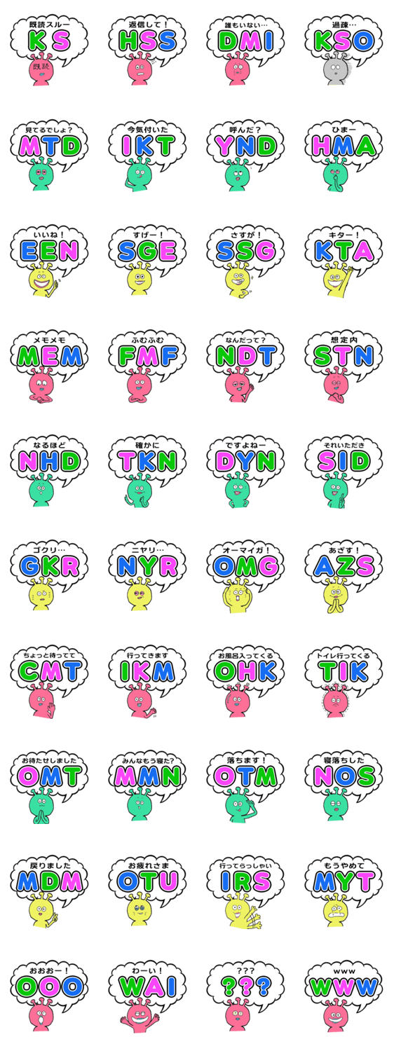 何でも略すスタンプグループチャット編 千葉勇太 コメントをどうぞ 言葉を何でも略すリャクス星人の、わいわいグループチャット編です!大人数でのトークに便利な言葉を3文字で伝えましょう!日常会話編もあるよ! このスタンプどう思う?!↓クリックで投票♪好き (0)かわいい (0)かっこいい (0)おもしろい (0)使いやすそう (0)欲しい (0)萌え (0)ほっこりする (0)おしゃれ (0)ゆるい (0)こわい (0)ウザい (0)キモい (0)ムカつく (0)持ってる (0)癒される (0)セクシー (0)個性的 (0)私は買わない (0)誰かプレゼントして! (0) 購入・プレゼントする Facebookでシェア Twitterでシェア