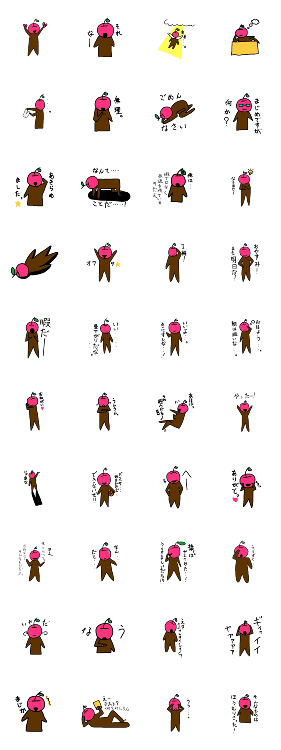 俺、りんご。 @RINGO0427 コメントをどうぞ 超自由に生きるりんごです。めんどくさがり屋でナルシストな中学生のりんごの自由に生きる様をスタンプにしてみました。 このスタンプどう思う?!↓クリックで投票♪好き (0)かわいい (0)かっこいい (0)おもしろい (0)使いやすそう (0)欲しい (0)萌え (0)ほっこりする (0)おしゃれ (0)ゆるい (0)こわい (0)ウザい (0)キモい (0)ムカつく (0)持ってる (0)癒される (0)セクシー (0)個性的 (0)私は買わない (0)誰かプレゼントして! (0) 購入・プレゼントする Facebookでシェア Twitterでシェア