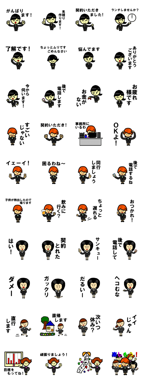 働く女性達 (君は1人じゃない) ルナ コメントをどうぞ OL、企画営業、商品営業、生保レディー(保険営業)、ルート販売など、ビジネスの場で働く女性達の応援スタンプ! このスタンプどう思う?!↓クリックで投票♪好き (0)かわいい (0)かっこいい (0)おもしろい (0)使いやすそう (0)欲しい (0)萌え (0)ほっこりする (0)おしゃれ (0)ゆるい (0)こわい (0)ウザい (0)キモい (0)ムカつく (0)持ってる (0)癒される (0)セクシー (0)個性的 (0)私は買わない (0)誰かプレゼントして! (0) 購入・プレゼントする Facebookでシェア Twitterでシェア