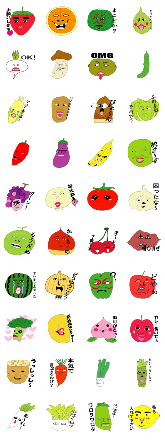 僕達ベジフルズ 俊太郎 コメントをどうぞ 野菜や果物が話し出すとこんな感じかなと思い作成してみました。日常使えるものはもちろん、ちょっと笑えるものや、ちょっと上から目線で話す野菜達を可愛がって下さい。 このスタンプどう思う?!↓クリックで投票♪好き (0)かわいい (0)かっこいい (0)おもしろい (0)使いやすそう (0)欲しい (0)萌え (0)ほっこりする (0)おしゃれ (0)ゆるい (0)こわい (0)ウザい (0)キモい (0)ムカつく (0)持ってる (0)癒される (0)セクシー (0)個性的 (0)私は買わない (0)誰かプレゼントして! (0) 購入・プレゼントする Facebookでシェア Twitterでシェア