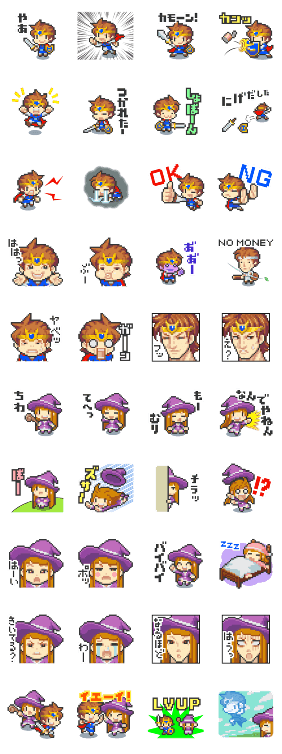 勇者と魔法使い ARIX コメントをどうぞ RPG風の勇者と魔法使い。ドット絵が懐かしいゲーム好きにはもってこい?ちょっと弱気な勇者と、ちょっとワガママな魔法使いのコンビだよ。 このスタンプどう思う?!↓クリックで投票♪好き (0)かわいい (0)かっこいい (0)おもしろい (0)使いやすそう (0)欲しい (0)萌え (0)ほっこりする (0)おしゃれ (0)ゆるい (0)こわい (0)ウザい (0)キモい (0)ムカつく (0)持ってる (0)癒される (0)セクシー (0)個性的 (0)私は買わない (0)誰かプレゼントして! (0) 購入・プレゼントする Facebookでシェア Twitterでシェア
