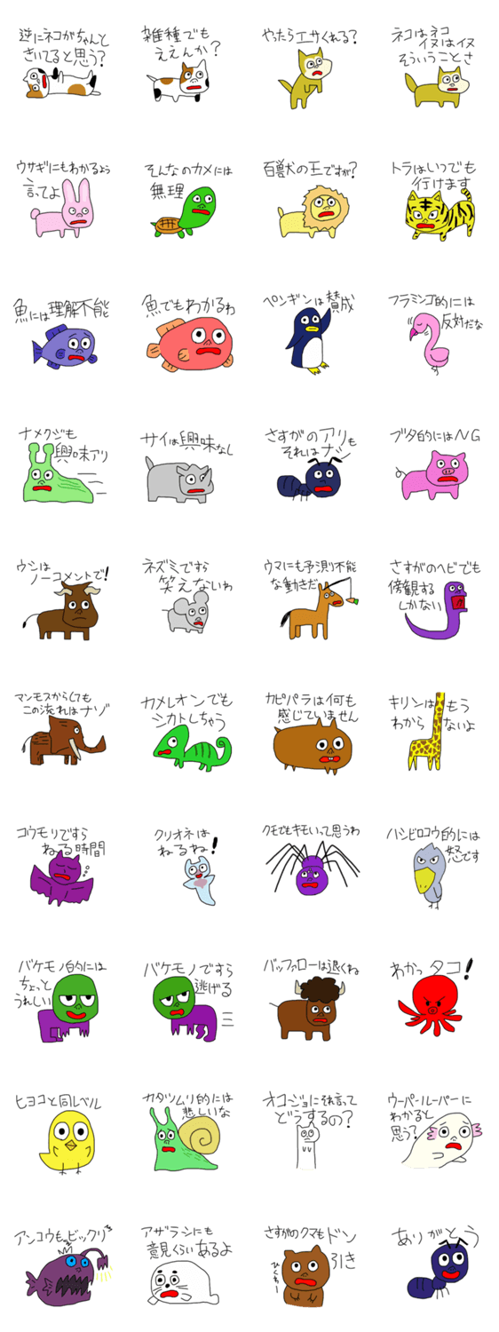 動物的にはどう? 善と悪を司る神々 コメントをどうぞ 動物的にはどう思っているのか代弁してくれるスタンプです。はっきり言いにくい時やかわいく意見を主張したい時にどうぞ。 このスタンプどう思う?!↓クリックで投票♪好き (0)かわいい (0)かっこいい (0)おもしろい (0)使いやすそう (0)欲しい (0)萌え (0)ほっこりする (0)おしゃれ (0)ゆるい (0)こわい (0)ウザい (0)キモい (0)ムカつく (0)持ってる (0)癒される (0)セクシー (0)個性的 (0)私は買わない (0)誰かプレゼントして! (0) 購入・プレゼントする Facebookでシェア Twitterでシェア