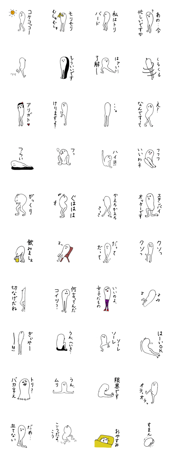 半鳥人 tarotaro コメントをどうぞ 上半身はとり、下半身は人間の彼。人語は話せます。 このスタンプどう思う?!↓クリックで投票♪好き (0)かわいい (0)かっこいい (0)おもしろい (0)使いやすそう (0)欲しい (0)萌え (0)ほっこりする (0)おしゃれ (0)ゆるい (0)こわい (0)ウザい (0)キモい (0)ムカつく (0)持ってる (0)癒される (0)セクシー (0)個性的 (0)私は買わない (0)誰かプレゼントして! (0) 購入・プレゼントする Facebookでシェア Twitterでシェア