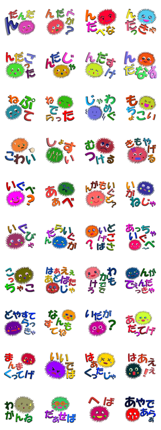 南部弁カラフルウニ i.k コメントをどうぞ 青森県南部地方の方言を話すカラフルなウニです。 このスタンプどう思う?!↓クリックで投票♪好き (0)かわいい (0)かっこいい (0)おもしろい (0)使いやすそう (0)欲しい (0)萌え (0)ほっこりする (0)おしゃれ (0)ゆるい (0)こわい (0)ウザい (0)キモい (0)ムカつく (0)持ってる (0)癒される (0)セクシー (0)個性的 (0)私は買わない (0)誰かプレゼントして! (0) 購入・プレゼントする Facebookでシェア Twitterでシェア