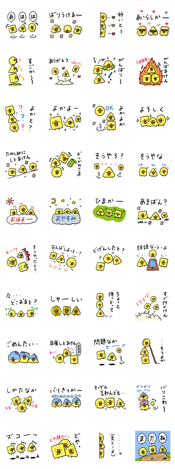 博多弁ひよこ3兄弟 うまうま コメントをどうぞ ひよこ3兄弟の第3弾は、福岡で使われる博多弁の日常会話スタンプ。博多弁のない言葉には標準語を入れてあるので、毎日使いやすいのが特徴です。【作】星空うまうま このスタンプどう思う?!↓クリックで投票♪好き (0)かわいい (0)かっこいい (0)おもしろい (0)使いやすそう (0)欲しい (0)萌え (0)ほっこりする (0)おしゃれ (0)ゆるい (0)こわい (0)ウザい (0)キモい (0)ムカつく (0)持ってる (0)癒される (0)セクシー (0)個性的 (0)私は買わない (0)誰かプレゼントして! (0) 購入・プレゼントする Facebookでシェア Twitterでシェア