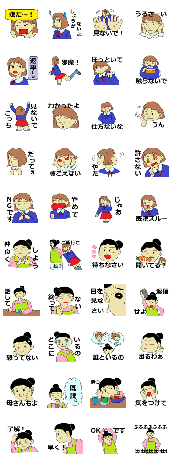 反抗期VS母親 えりにゃんた コメントをどうぞ 反抗期の女子学生とお母さんのバトルスタンプ。楽しく使って頂きたいです。 このスタンプどう思う?!↓クリックで投票♪好き (0)かわいい (0)かっこいい (0)おもしろい (0)使いやすそう (0)欲しい (0)萌え (0)ほっこりする (0)おしゃれ (0)ゆるい (0)こわい (0)ウザい (0)キモい (0)ムカつく (0)持ってる (0)癒される (0)セクシー (0)個性的 (0)私は買わない (0)誰かプレゼントして! (0) 購入・プレゼントする Facebookでシェア Twitterでシェア