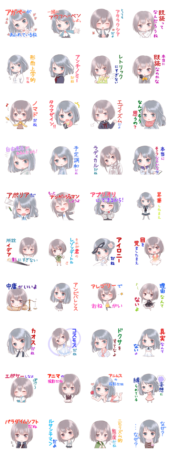 哲学・心理学 香月 結衣 コメントをどうぞ 日常会話で使える哲学・心理学用語を集めました。一般的な用語から、あまり聞きなれない用語まで、哲学・心理学に興味のある方や、インテリぶりたい方にオススメです。 このスタンプどう思う?!↓クリックで投票♪好き (0)かわいい (0)かっこいい (0)おもしろい (0)使いやすそう (0)欲しい (0)萌え (0)ほっこりする (0)おしゃれ (0)ゆるい (0)こわい (0)ウザい (0)キモい (0)ムカつく (0)持ってる (0)癒される (0)セクシー (0)個性的 (0)私は買わない (0)誰かプレゼントして! (0) 購入・プレゼントする Facebookでシェア Twitterでシェア
