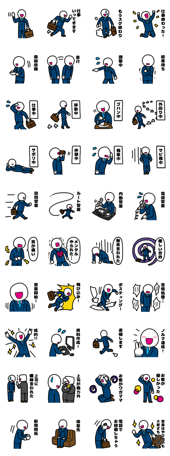 営業職スタンプ mediaG コメントをどうぞ 営業職スタンプです。営業員、営業マン、販売従事者、セールスウーマン、セールスマン、サラリーマン、ビジネスマンの方々が普段使える便利なスタンプです。 このスタンプどう思う?!↓クリックで投票♪好き (0)かわいい (0)かっこいい (0)おもしろい (0)使いやすそう (0)欲しい (0)萌え (0)ほっこりする (0)おしゃれ (0)ゆるい (0)こわい (0)ウザい (0)キモい (0)ムカつく (0)持ってる (0)癒される (0)セクシー (0)個性的 (0)私は買わない (0)誰かプレゼントして! (0) 購入・プレゼントする Facebookでシェア Twitterでシェア
