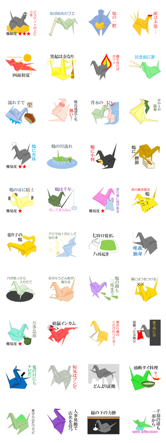 四十羽鶴 21(801-840羽目) プラスパルス コメントをどうぞ 折紙の鶴が僕に言いました。鶴の世界のことわざをスタンプにしてくれと・・・今回も、千羽の中から四十羽を厳選しました。これで現在八百四十羽です。 このスタンプどう思う?!↓クリックで投票♪好き (0)かわいい (0)かっこいい (0)おもしろい (0)使いやすそう (0)欲しい (0)萌え (0)ほっこりする (0)おしゃれ (0)ゆるい (0)こわい (0)ウザい (0)キモい (0)ムカつく (0)持ってる (0)癒される (0)セクシー (0)個性的 (0)私は買わない (0)誰かプレゼントして! (0) 購入・プレゼントする Facebookでシェア Twitterでシェア
