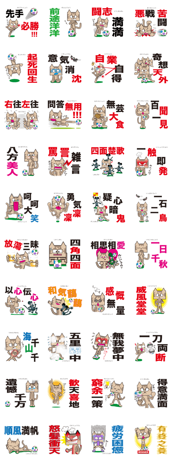 四文字熟ゴー! TM-Cat & Max Mouse vol.8 M.J.Forward コメントをどうぞ これがあれば、四文字熟語の達人!になれます!? スタンプで使いやすそうなヤツを厳選しました。分からない時は調べてくださいね。キャラはサッカー猫のTM-CATです。 このスタンプどう思う?!↓クリックで投票♪好き (0)かわいい (0)かっこいい (0)おもしろい (0)使いやすそう (0)欲しい (0)萌え (0)ほっこりする (0)おしゃれ (0)ゆるい (0)こわい (0)ウザい (0)キモい (0)ムカつく (0)持ってる (0)癒される (0)セクシー (0)個性的 (0)私は買わない (0)誰かプレゼントして! (0) 購入・プレゼントする Facebookでシェア Twitterでシェア