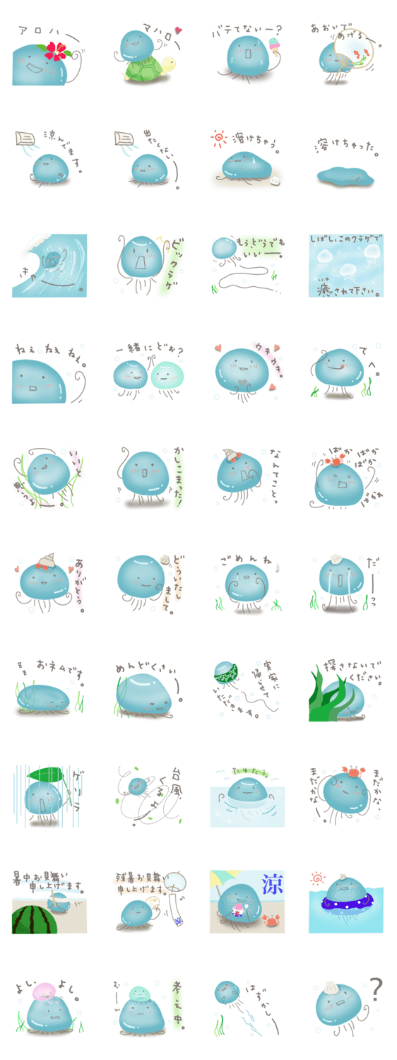 夏の涼しげゆるクラゲ。 Shiorin コメントをどうぞ 半透明のゆるい涼しげなくらげです。暑い時、このくらげで癒されてください。暑中見舞いや残暑見舞いもあります。 このスタンプどう思う?!↓クリックで投票♪好き (0)かわいい (0)かっこいい (0)おもしろい (0)使いやすそう (0)欲しい (0)萌え (0)ほっこりする (0)おしゃれ (0)ゆるい (0)こわい (0)ウザい (0)キモい (0)ムカつく (0)持ってる (0)癒される (0)セクシー (0)個性的 (0)私は買わない (0)誰かプレゼントして! (0) 購入・プレゼントする Facebookでシェア Twitterでシェア