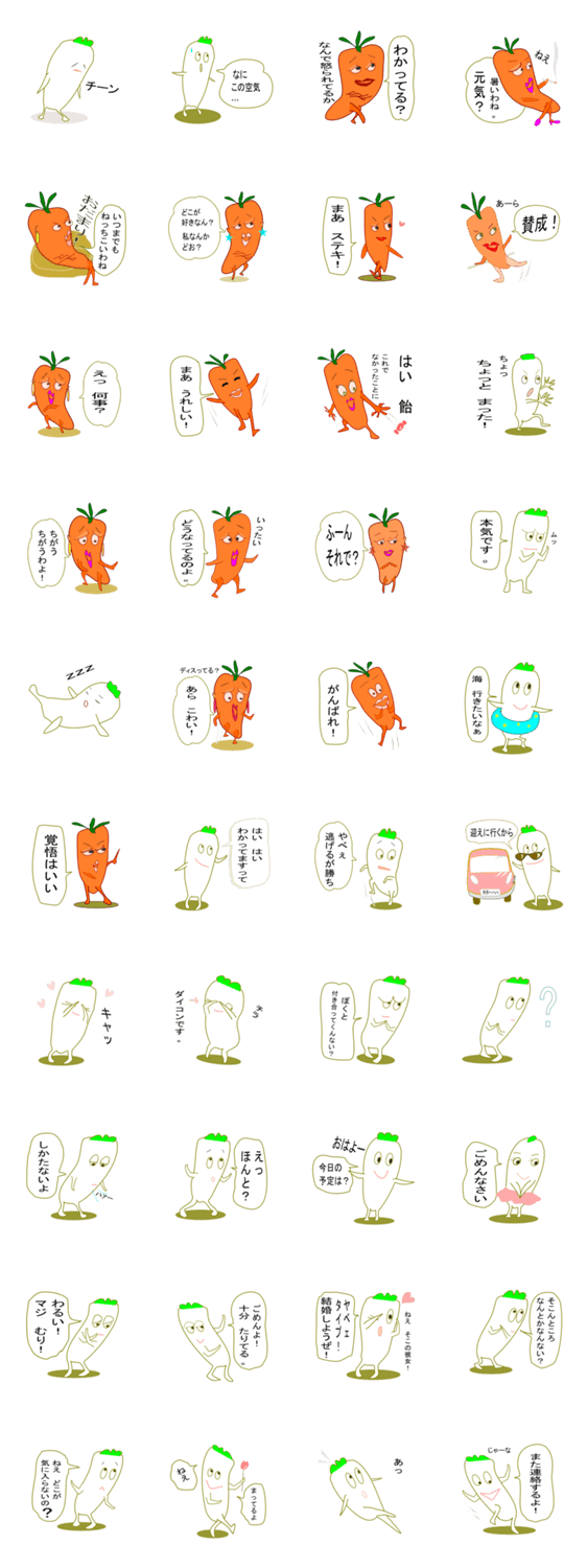大根君とにんじん君 エルモ コメントをどうぞ ある日 大根君がにんじん君にいろいろ相談しました。そして。。。 このスタンプどう思う?!↓クリックで投票♪好き (0)かわいい (0)かっこいい (0)おもしろい (0)使いやすそう (0)欲しい (0)萌え (0)ほっこりする (0)おしゃれ (0)ゆるい (0)こわい (0)ウザい (0)キモい (0)ムカつく (0)持ってる (0)癒される (0)セクシー (0)個性的 (0)私は買わない (0)誰かプレゼントして! (0) 購入・プレゼントする Facebookでシェア Twitterでシェア