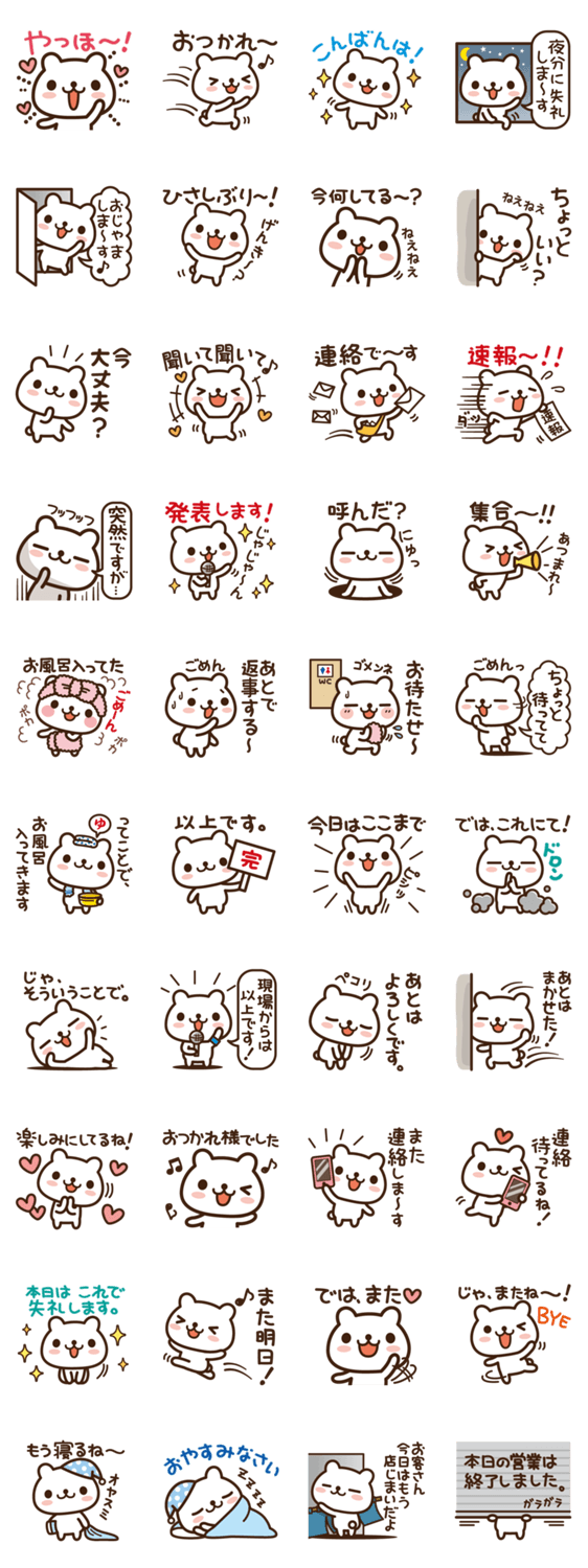 始まりと終わりのクマ みーすけ コメントをどうぞ トークを始める時、終わる時にとっても便利なスタンプです。かわいい白クマがキュートにごあいさつ&ゆるっと終わらせてくれます♪ このスタンプどう思う?!↓クリックで投票♪好き (0)かわいい (0)かっこいい (0)おもしろい (0)使いやすそう (0)欲しい (0)萌え (0)ほっこりする (0)おしゃれ (0)ゆるい (0)こわい (0)ウザい (0)キモい (0)ムカつく (0)持ってる (0)癒される (0)セクシー (0)個性的 (0)私は買わない (0)誰かプレゼントして! (0) 購入・プレゼントする Facebookでシェア Twitterでシェア
