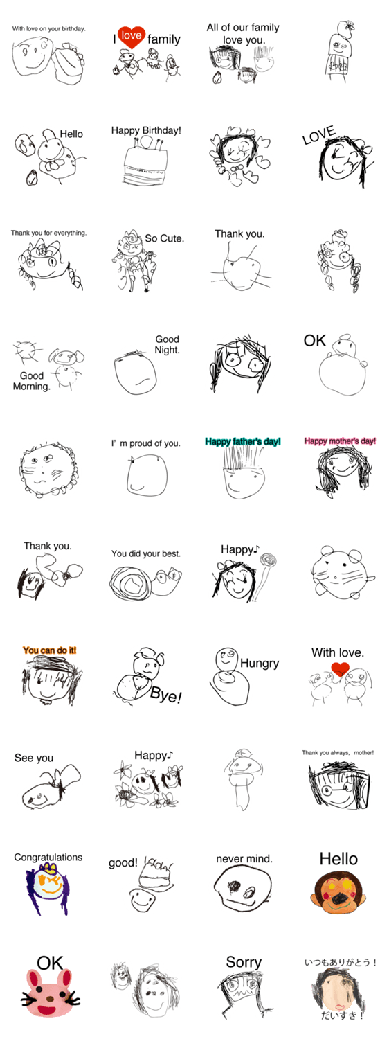 娘(4歳)の描いたスタンプ mihha コメントをどうぞ 2010年生まれの娘が描いた絵を溜め続けてそろそろ…と思って作りました。親バカです。この時期しか描けない絵を使って家族のコミュニケーション用に!10年後に娘と使いたい このスタンプどう思う?!↓クリックで投票♪好き (0)かわいい (0)かっこいい (0)おもしろい (0)使いやすそう (0)欲しい (0)萌え (0)ほっこりする (0)おしゃれ (0)ゆるい (0)こわい (0)ウザい (0)キモい (0)ムカつく (0)持ってる (0)癒される (0)セクシー (0)個性的 (0)私は買わない (0)誰かプレゼントして! (0) 購入・プレゼントする Facebookでシェア Twitterでシェア