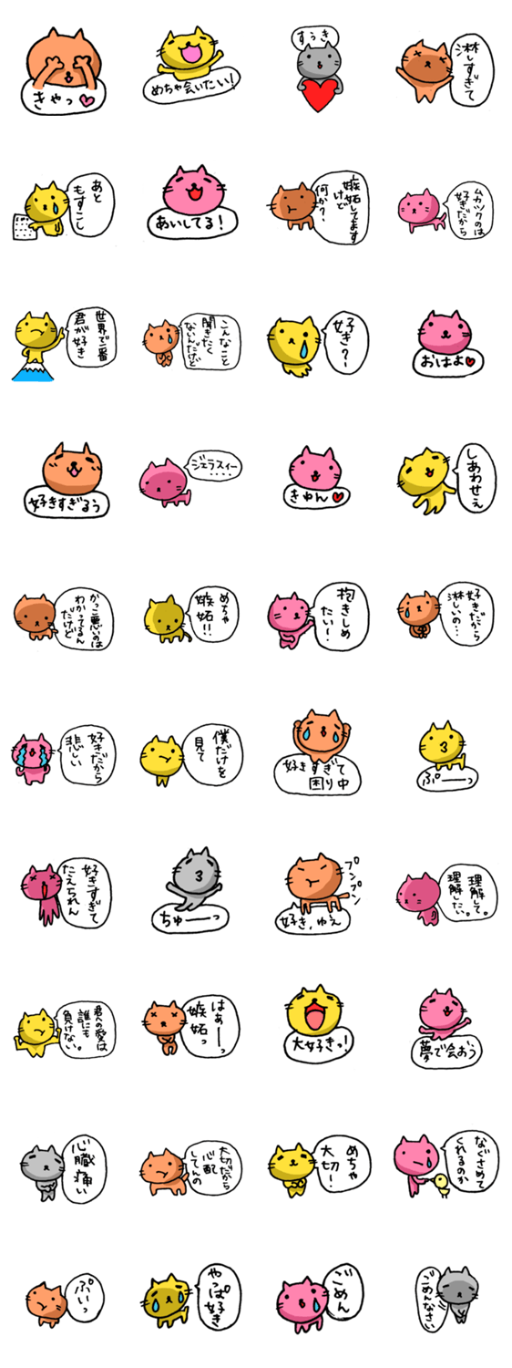 嫉妬ネコ SHOKO643 コメントをどうぞ 嫉妬ネコ。ジェラシーたっぷり。愛しすぎる故嫉妬する猫たちです。 このスタンプどう思う?!↓クリックで投票♪好き (0)かわいい (0)かっこいい (0)おもしろい (0)使いやすそう (0)欲しい (0)萌え (0)ほっこりする (0)おしゃれ (0)ゆるい (0)こわい (0)ウザい (0)キモい (0)ムカつく (0)持ってる (0)癒される (0)セクシー (0)個性的 (0)私は買わない (0)誰かプレゼントして! (0) 購入・プレゼントする Facebookでシェア Twitterでシェア