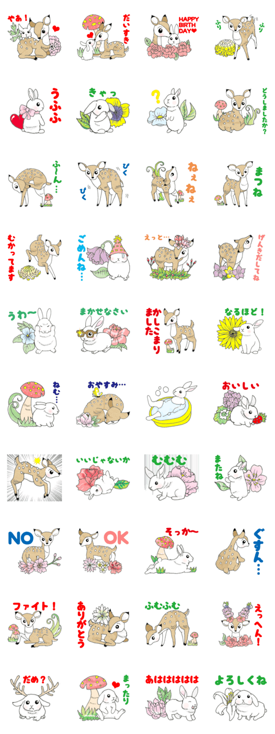 子鹿とうさぎの仲良し日記 三田ミロ コメントをどうぞ 子鹿とうさぎは大の仲良し。いつも一緒に、泣いて笑って、過ごしています。そんな二匹で会話を楽しんで頂けたらと思います。 このスタンプどう思う?!↓クリックで投票♪好き (0)かわいい (0)かっこいい (0)おもしろい (0)使いやすそう (0)欲しい (0)萌え (0)ほっこりする (0)おしゃれ (0)ゆるい (0)こわい (0)ウザい (0)キモい (0)ムカつく (0)持ってる (0)癒される (0)セクシー (0)個性的 (0)私は買わない (0)誰かプレゼントして! (0) 購入・プレゼントする Facebookでシェア Twitterでシェア