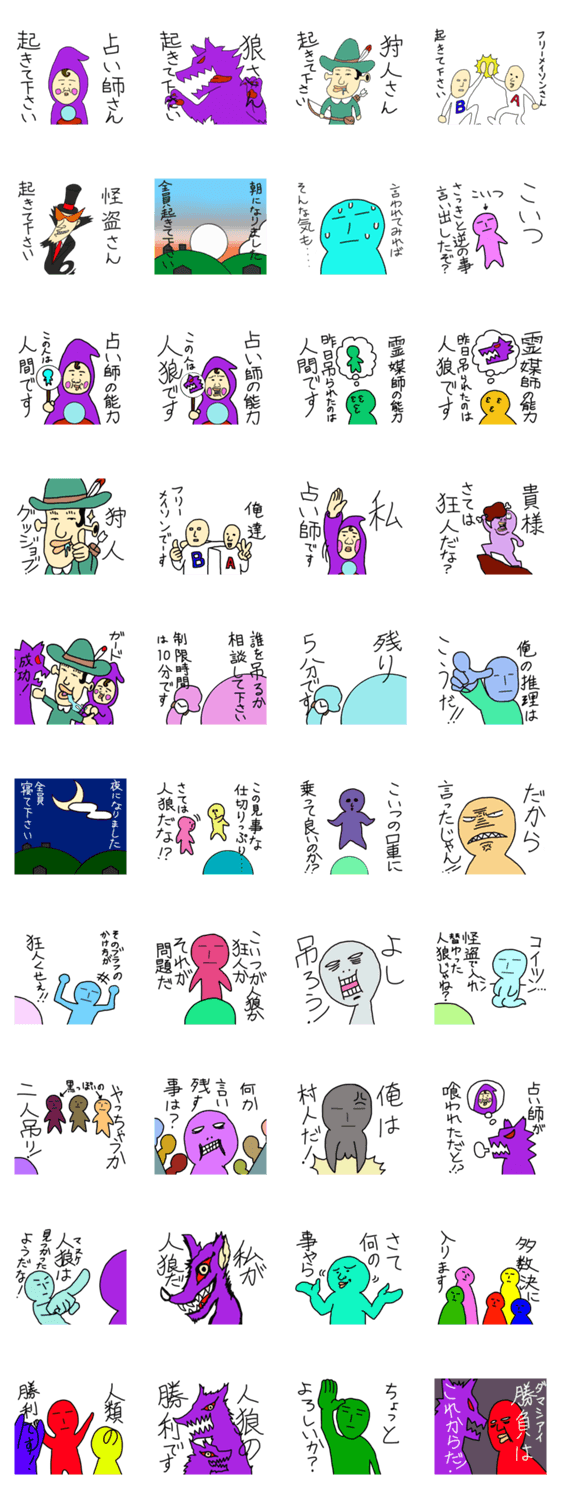 実際に遊べる人狼スタンプ 大越 慎一郎 コメントをどうぞ 大人気のパーティゲーム「人狼」で頻繁に起こるシチュエーションをスタンプ化!実際に遊べるようデザインしましたので、友達も誘って人狼を始めてみよう! このスタンプどう思う?!↓クリックで投票♪好き (0)かわいい (0)かっこいい (0)おもしろい (0)使いやすそう (0)欲しい (0)萌え (0)ほっこりする (0)おしゃれ (0)ゆるい (0)こわい (0)ウザい (0)キモい (0)ムカつく (0)持ってる (0)癒される (0)セクシー (0)個性的 (0)私は買わない (0)誰かプレゼントして! (0) 購入・プレゼントする Facebookでシェア Twitterでシェア