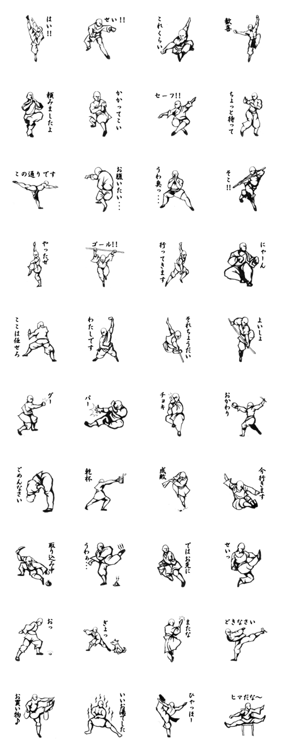 少林寺な人たち TKLab コメントをどうぞ 少林寺拳法のかっこ良すぎるポーズと少林寺な人たちの日常をスタンプにしました。きっとかっこ良すぎるポーズをとりながらこんなことを言ってるんだと思うのです。 このスタンプどう思う?!↓クリックで投票♪好き (0)かわいい (0)かっこいい (0)おもしろい (0)使いやすそう (0)欲しい (0)萌え (0)ほっこりする (0)おしゃれ (0)ゆるい (0)こわい (0)ウザい (0)キモい (0)ムカつく (0)持ってる (0)癒される (0)セクシー (0)個性的 (0)私は買わない (0)誰かプレゼントして! (0) 購入・プレゼントする Facebookでシェア Twitterでシェア