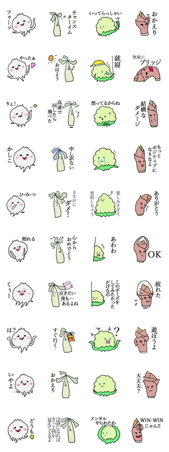 山菜’s yuuuu コメントをどうぞ 山菜たちがやって来た!ちょっぴり上から目線な山菜たちのシュールでかわいいスタンプ登場! このスタンプどう思う?!↓クリックで投票♪好き (0)かわいい (0)かっこいい (0)おもしろい (0)使いやすそう (0)欲しい (0)萌え (0)ほっこりする (0)おしゃれ (0)ゆるい (0)こわい (0)ウザい (0)キモい (0)ムカつく (0)持ってる (0)癒される (0)セクシー (0)個性的 (0)私は買わない (0)誰かプレゼントして! (0) 購入・プレゼントする Facebookでシェア Twitterでシェア