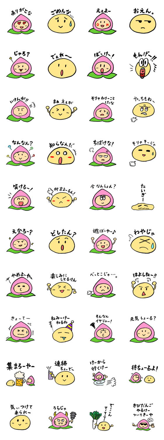 岡山弁スタンプ(きびだんご&白桃) 八木間ゆみ コメントをどうぞ 岡山名物のきびだんごと白桃のキャラクターがお届けする岡山弁スタンプ。日常のコミュニケーションに使ってみられ~。 このスタンプどう思う?!↓クリックで投票♪好き (0)かわいい (0)かっこいい (0)おもしろい (0)使いやすそう (0)欲しい (0)萌え (0)ほっこりする (0)おしゃれ (0)ゆるい (0)こわい (0)ウザい (0)キモい (0)ムカつく (0)持ってる (0)癒される (0)セクシー (0)個性的 (0)私は買わない (0)誰かプレゼントして! (0) 購入・プレゼントする Facebookでシェア Twitterでシェア