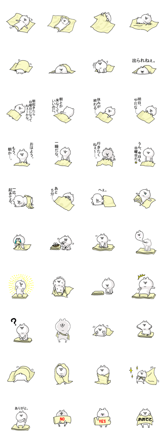 布団とクマっぽい奴。 かよじゃが コメントをどうぞ 布団って心地よくて、なかなか離れられないんです。そんな布団から離れられないクマっぽい奴だっているんです。 このスタンプどう思う?!↓クリックで投票♪好き (0)かわいい (0)かっこいい (0)おもしろい (0)使いやすそう (0)欲しい (0)萌え (0)ほっこりする (0)おしゃれ (0)ゆるい (0)こわい (0)ウザい (0)キモい (0)ムカつく (0)持ってる (0)癒される (0)セクシー (0)個性的 (0)私は買わない (0)誰かプレゼントして! (0) 購入・プレゼントする Facebookでシェア Twitterでシェア