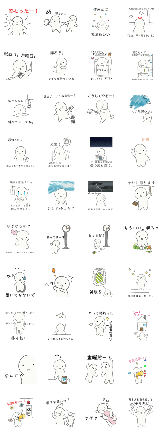 帰りたい時に使うスタンプ hau コメントをどうぞ 帰りたいと思った時に使うスタンプです。帰れなかった時は愚痴用に使って下さい このスタンプどう思う?!↓クリックで投票♪好き (0)かわいい (0)かっこいい (0)おもしろい (0)使いやすそう (0)欲しい (0)萌え (0)ほっこりする (0)おしゃれ (0)ゆるい (0)こわい (0)ウザい (0)キモい (0)ムカつく (0)持ってる (0)癒される (0)セクシー (0)個性的 (0)私は買わない (0)誰かプレゼントして! (0) 購入・プレゼントする Facebookでシェア Twitterでシェア