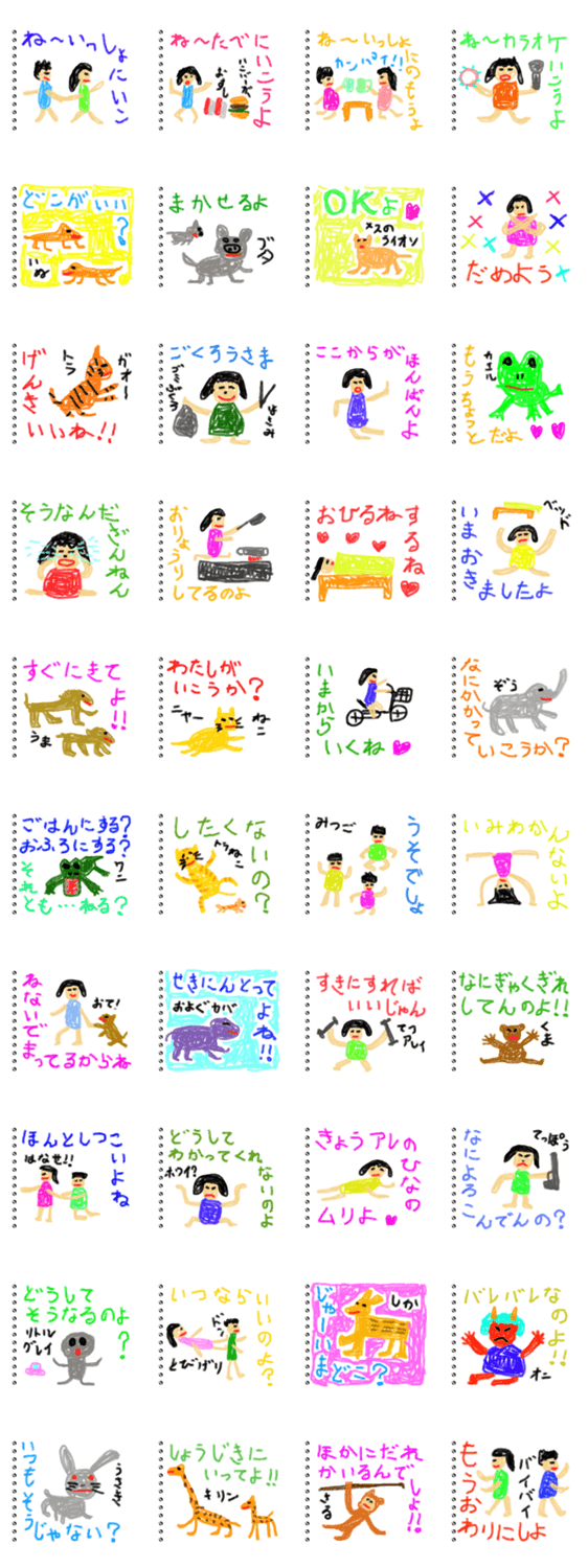 幼稚園児の絵日記 2(大人の女性用) TK777 コメントをどうぞ 幼稚園児が描いたみたいですが内容はおとなの女性向きです。彼氏や友人との会話にお使いください。 このスタンプどう思う?!↓クリックで投票♪好き (0)かわいい (0)かっこいい (0)おもしろい (0)使いやすそう (0)欲しい (0)萌え (0)ほっこりする (0)おしゃれ (0)ゆるい (0)こわい (0)ウザい (0)キモい (0)ムカつく (0)持ってる (0)癒される (0)セクシー (0)個性的 (0)私は買わない (0)誰かプレゼントして! (0) 購入・プレゼントする Facebookでシェア Twitterでシェア