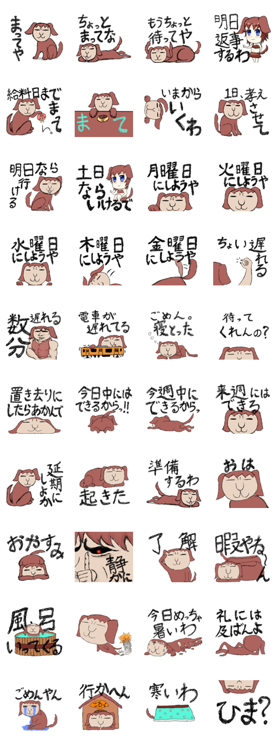 待たせる関西弁の犬 働きたくないゐつき コメントをどうぞ これは、mydogかな平気で人を待たせる犬。待ち合わせの時、予定を先延ばしにする時、長文を打つときなどにお使いください。稀に擬人化します。名前は「こるく」です。 このスタンプどう思う?!↓クリックで投票♪好き (0)かわいい (0)かっこいい (0)おもしろい (0)使いやすそう (0)欲しい (0)萌え (0)ほっこりする (0)おしゃれ (0)ゆるい (0)こわい (0)ウザい (0)キモい (0)ムカつく (0)持ってる (0)癒される (0)セクシー (0)個性的 (0)私は買わない (0)誰かプレゼントして! (0) 購入・プレゼントする Facebookでシェア Twitterでシェア
