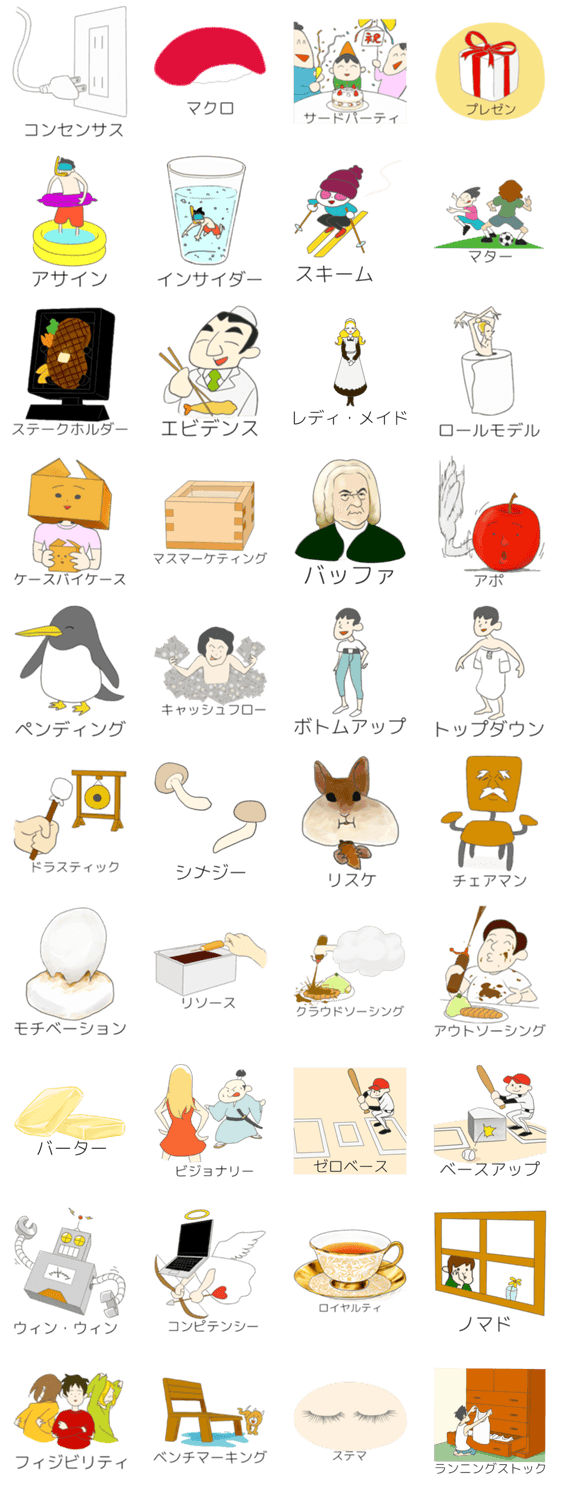 必携カタカナ語まとめ osobaman コメントをどうぞ プレゼンはプレゼント、バーターはバター等、カタカナ語に出会う度に頭に浮かぶイメージをスタンプ化。ビジネスライクなトークを演出する、マストなワード全40種。 このスタンプどう思う?!↓クリックで投票♪好き (0)かわいい (0)かっこいい (0)おもしろい (0)使いやすそう (0)欲しい (0)萌え (0)ほっこりする (0)おしゃれ (0)ゆるい (0)こわい (0)ウザい (0)キモい (0)ムカつく (0)持ってる (0)癒される (0)セクシー (0)個性的 (0)私は買わない (0)誰かプレゼントして! (0) 購入・プレゼントする Facebookでシェア Twitterでシェア